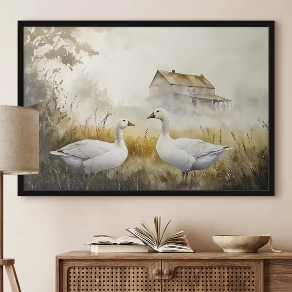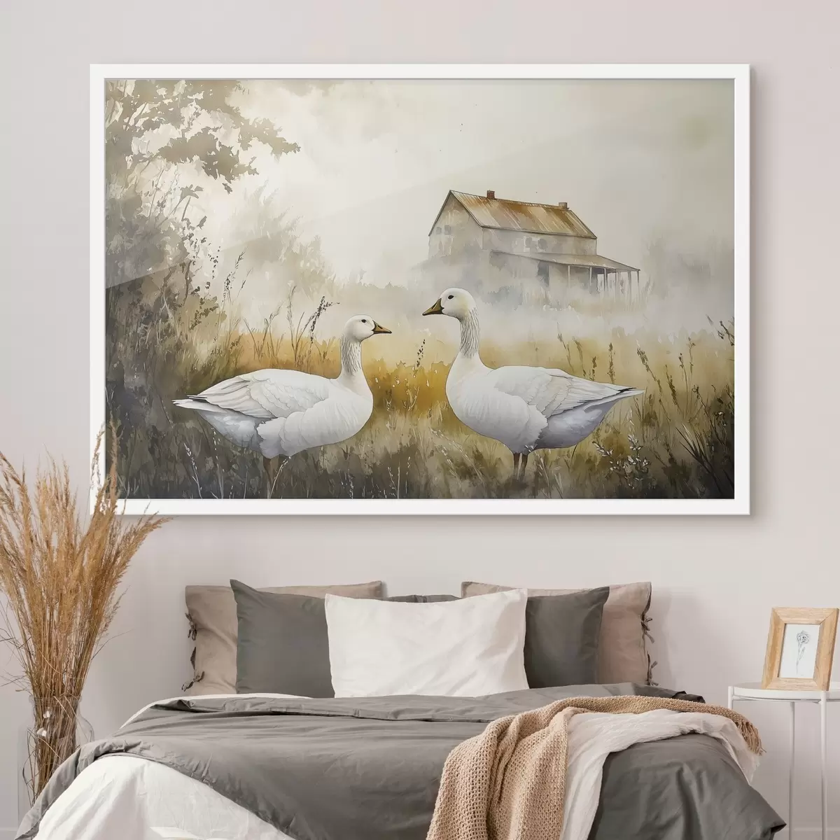 Poster Estilo acuarela gansos en el campo, pueblo, rústico f44024