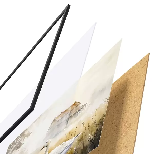 El póster consta de marco, plexiglás, imagen impresa y soporte de aglomerado. El póster puede colgarse inmediatamente en la pared gracias a los soportes de la parte posterior.