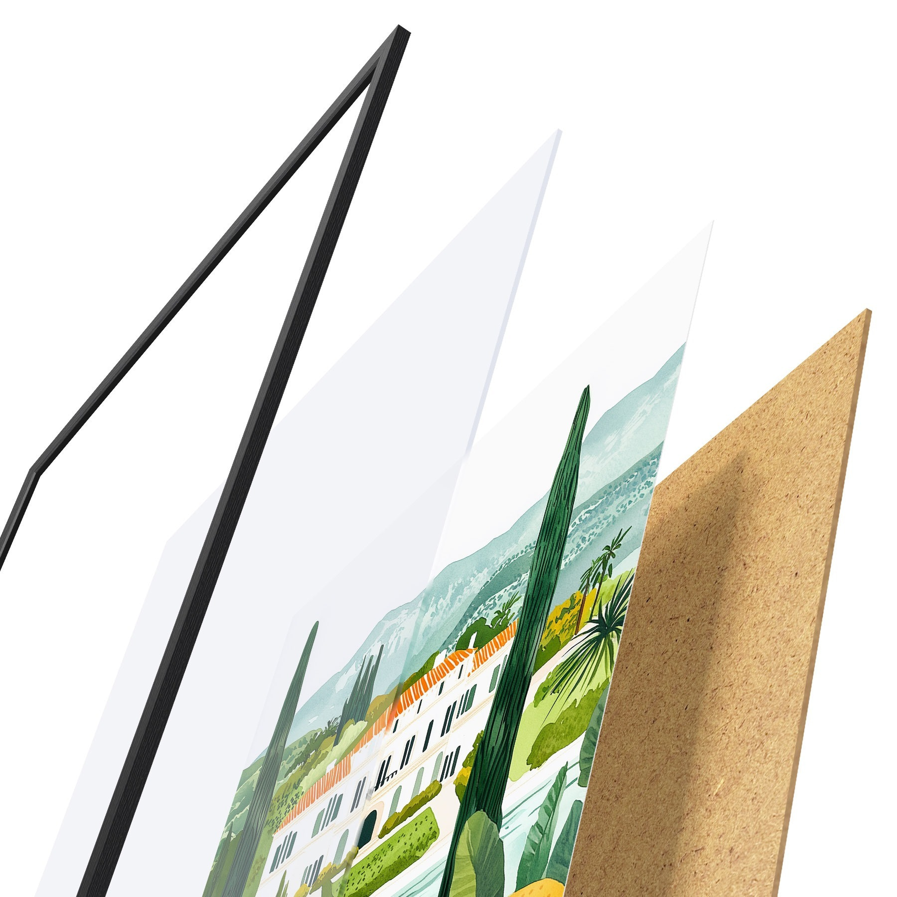El póster consta de marco, plexiglás, imagen impresa y soporte de aglomerado. El póster puede colgarse inmediatamente en la pared gracias a los soportes de la parte posterior.