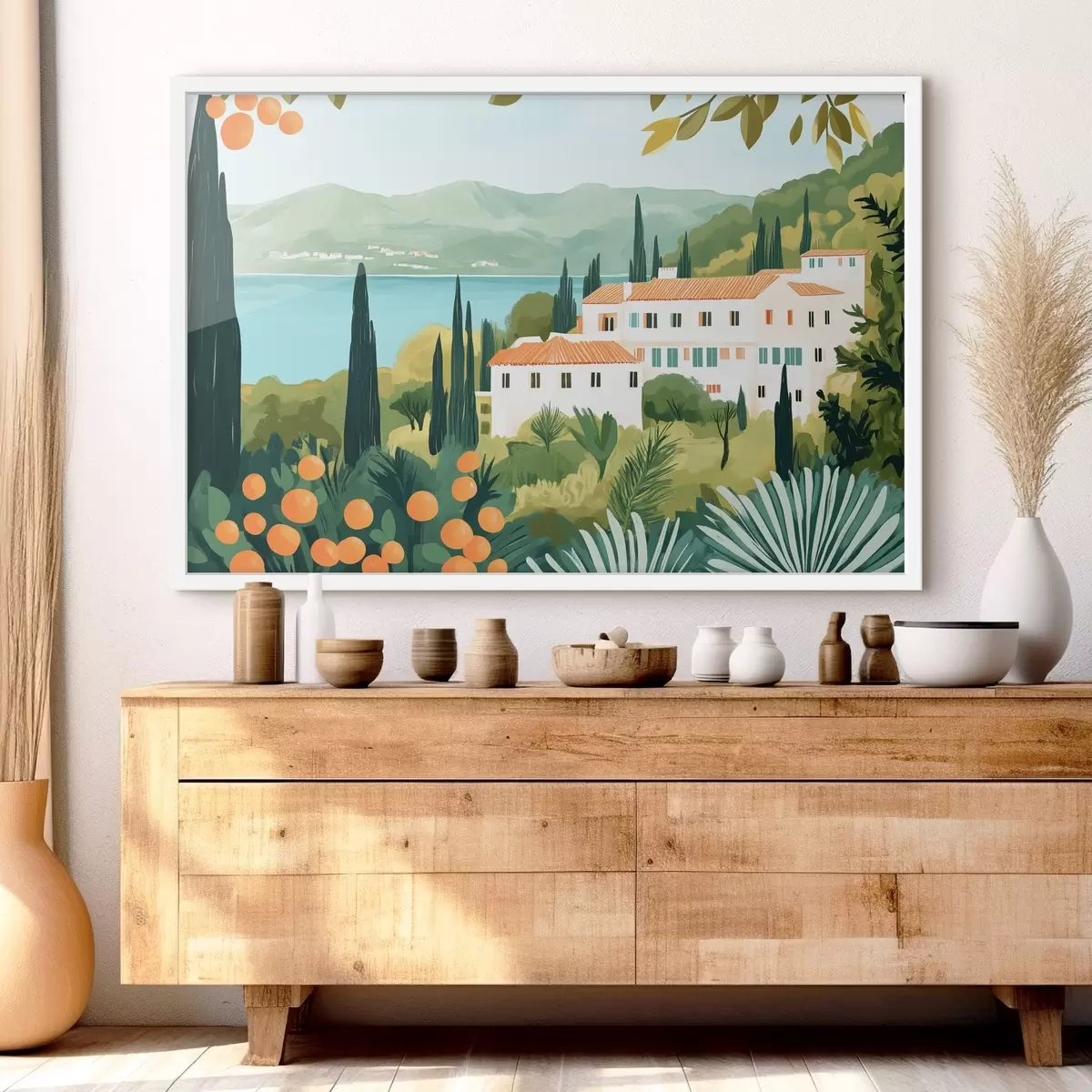 Poster Paisajes mediterráneos con naranjos y casas, costa del mar Nr f44027