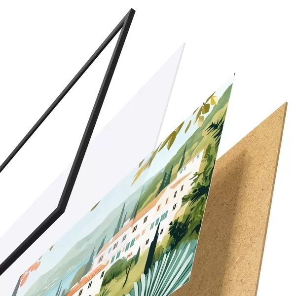 El póster consta de marco, plexiglás, imagen impresa y soporte de aglomerado. El póster puede colgarse inmediatamente en la pared gracias a los soportes de la parte posterior.