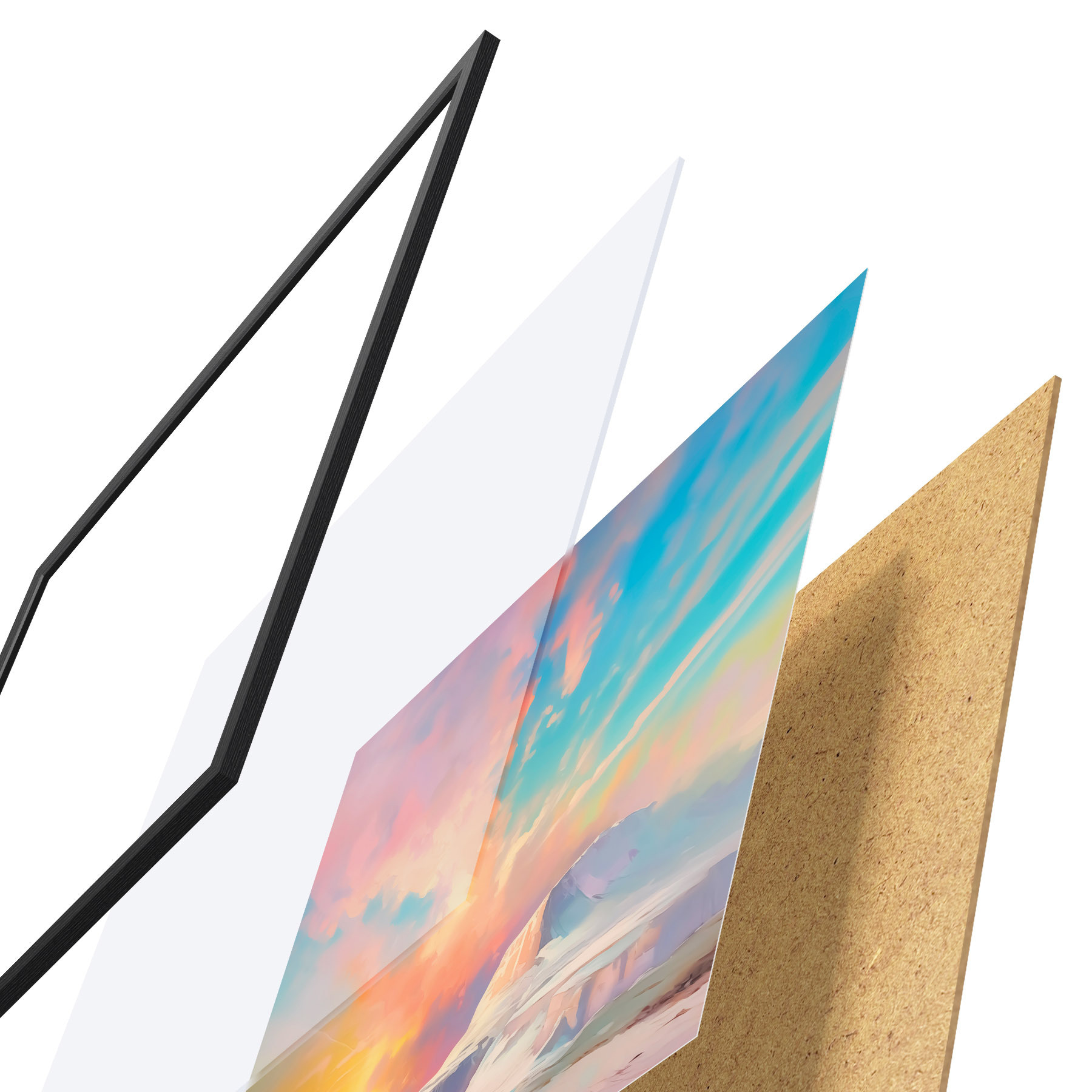 El póster consta de marco, plexiglás, imagen impresa y soporte de aglomerado. El póster puede colgarse inmediatamente en la pared gracias a los soportes de la parte posterior.