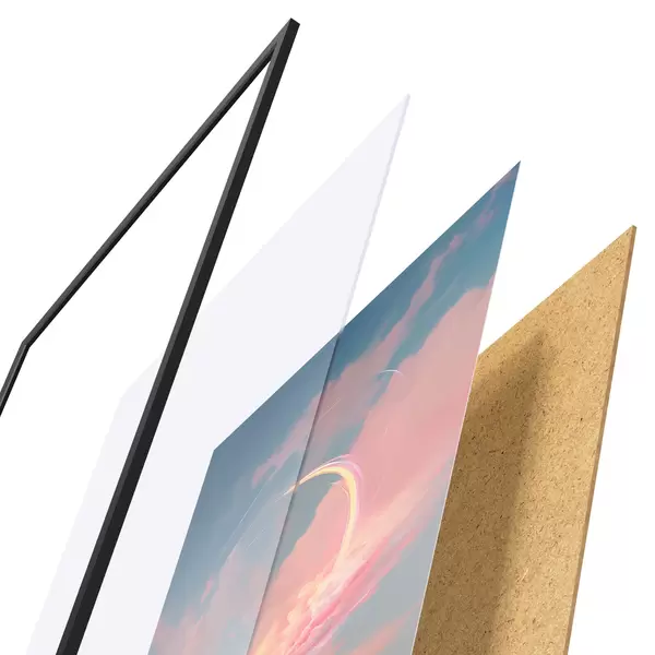 El póster consta de marco, plexiglás, imagen impresa y soporte de aglomerado. El póster puede colgarse inmediatamente en la pared gracias a los soportes de la parte posterior.