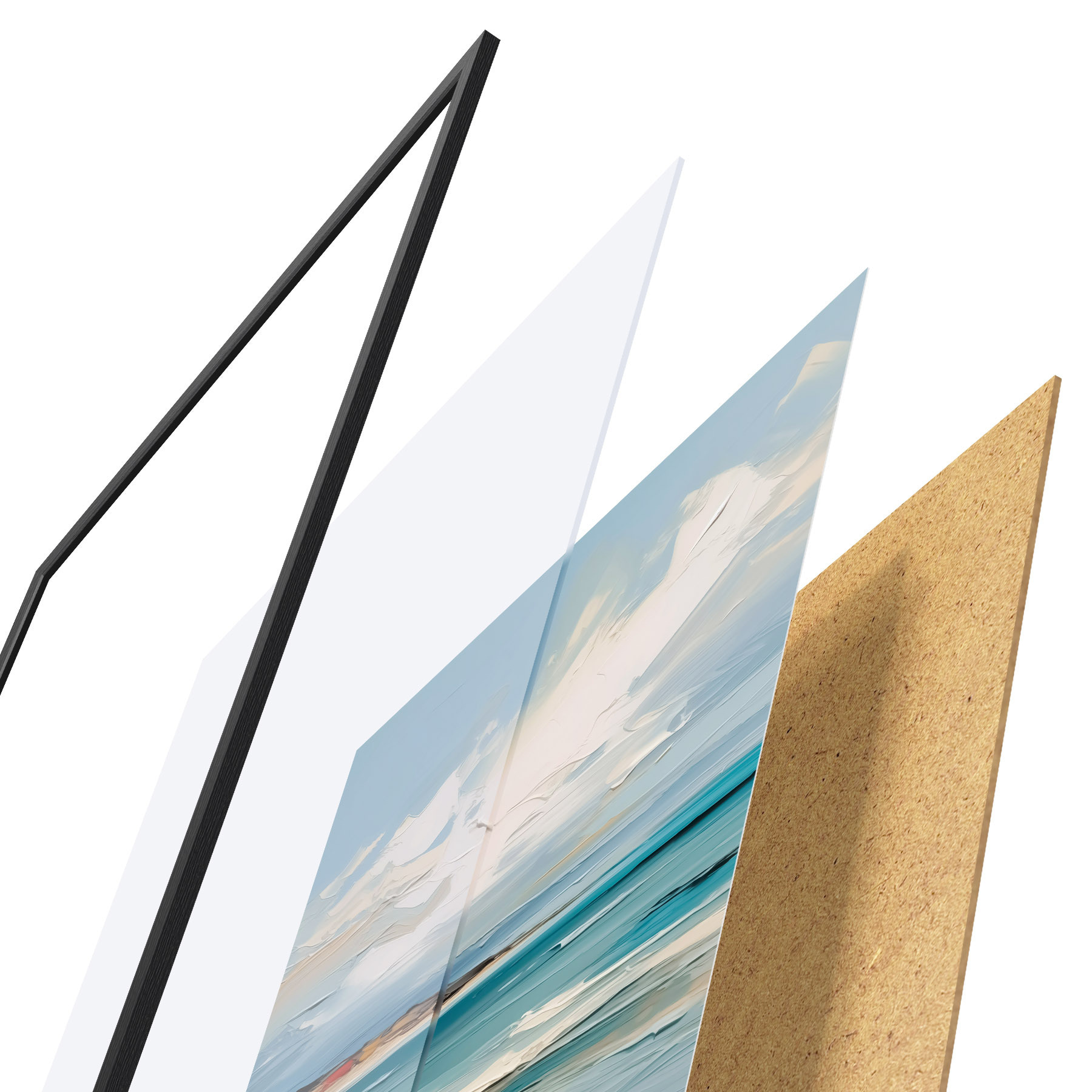 El póster consta de marco, plexiglás, imagen impresa y soporte de aglomerado. El póster puede colgarse inmediatamente en la pared gracias a los soportes de la parte posterior.