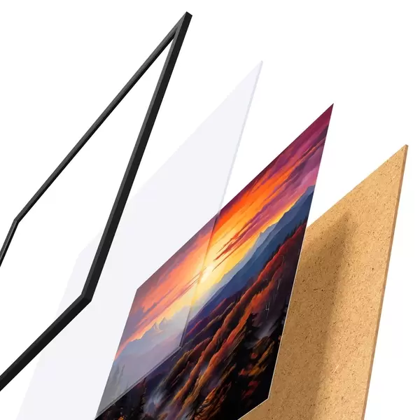 El póster consta de marco, plexiglás, imagen impresa y soporte de aglomerado. El póster puede colgarse inmediatamente en la pared gracias a los soportes de la parte posterior.