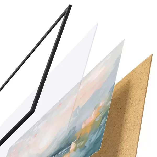 El póster consta de marco, plexiglás, imagen impresa y soporte de aglomerado. El póster puede colgarse inmediatamente en la pared gracias a los soportes de la parte posterior.
