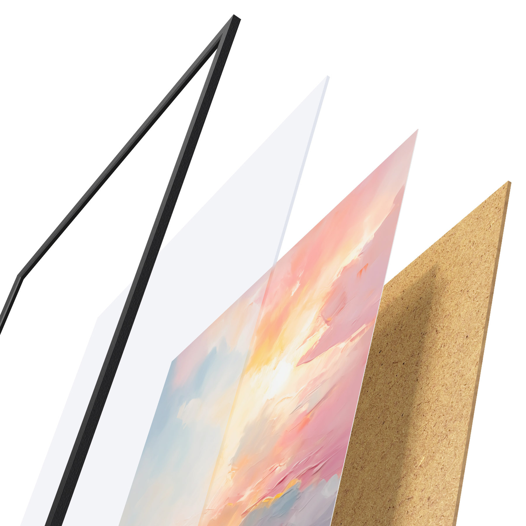 El póster consta de marco, plexiglás, imagen impresa y soporte de aglomerado. El póster puede colgarse inmediatamente en la pared gracias a los soportes de la parte posterior.