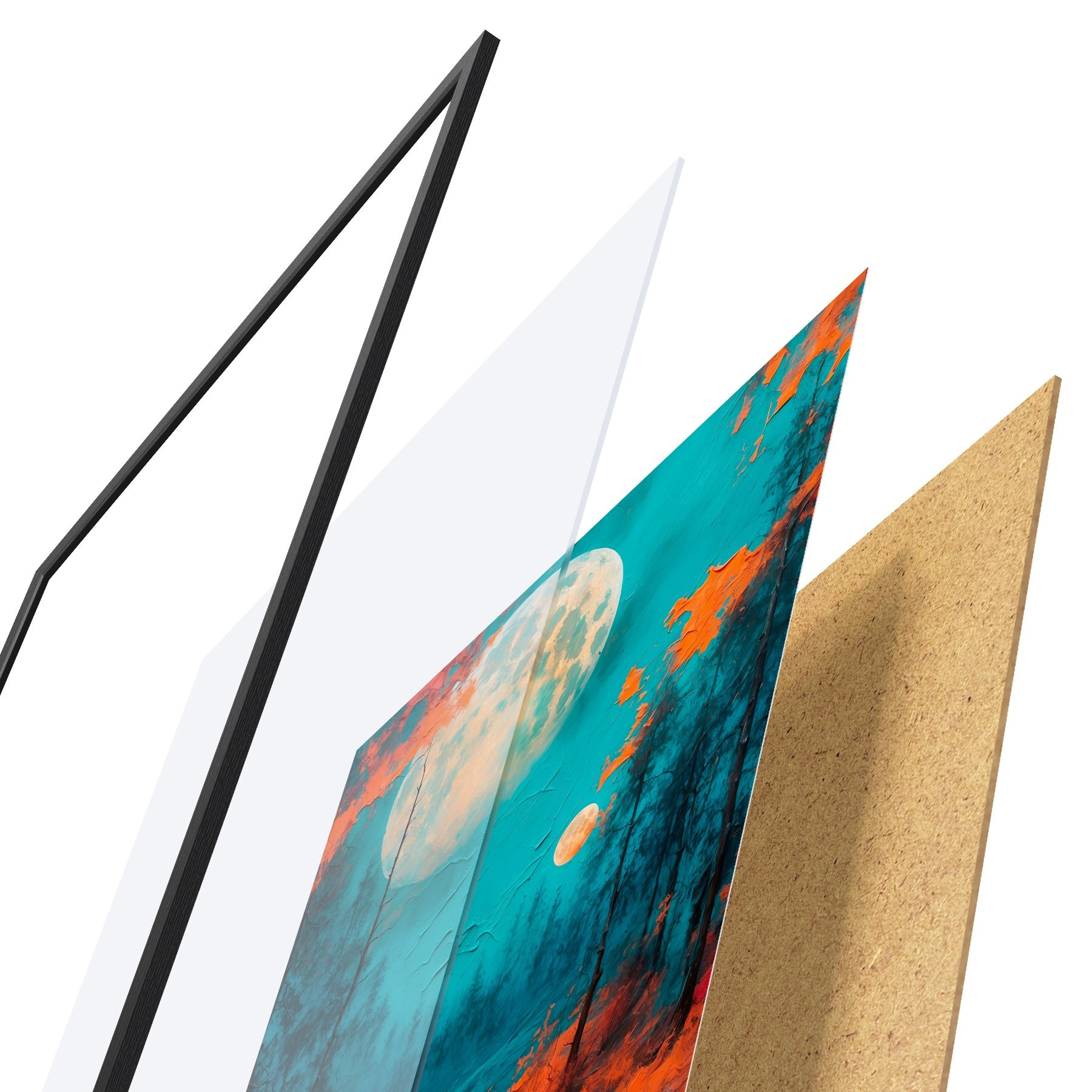 El póster consta de marco, plexiglás, imagen impresa y soporte de aglomerado. El póster puede colgarse inmediatamente en la pared gracias a los soportes de la parte posterior.