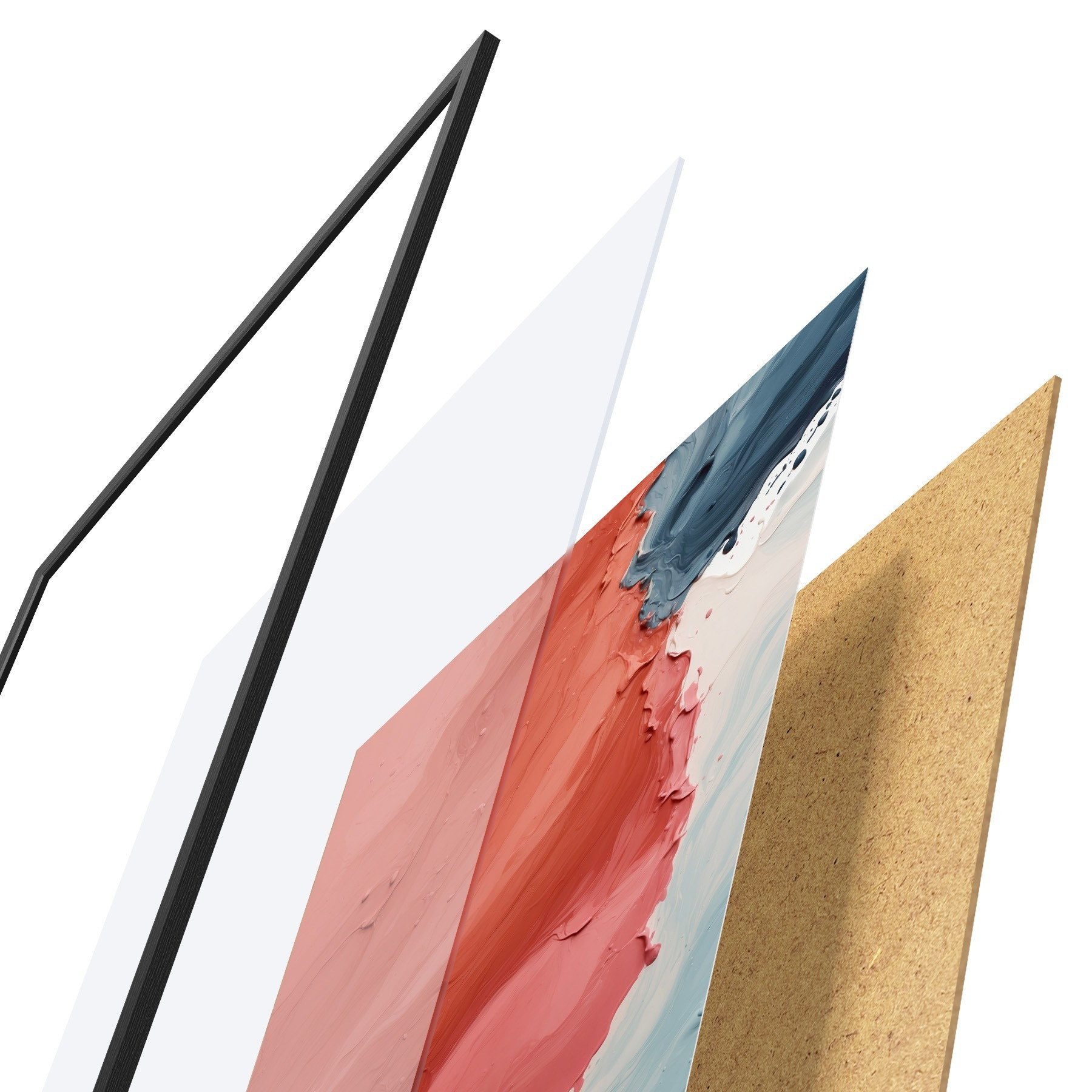 El póster consta de marco, plexiglás, imagen impresa y soporte de aglomerado. El póster puede colgarse inmediatamente en la pared gracias a los soportes de la parte posterior.
