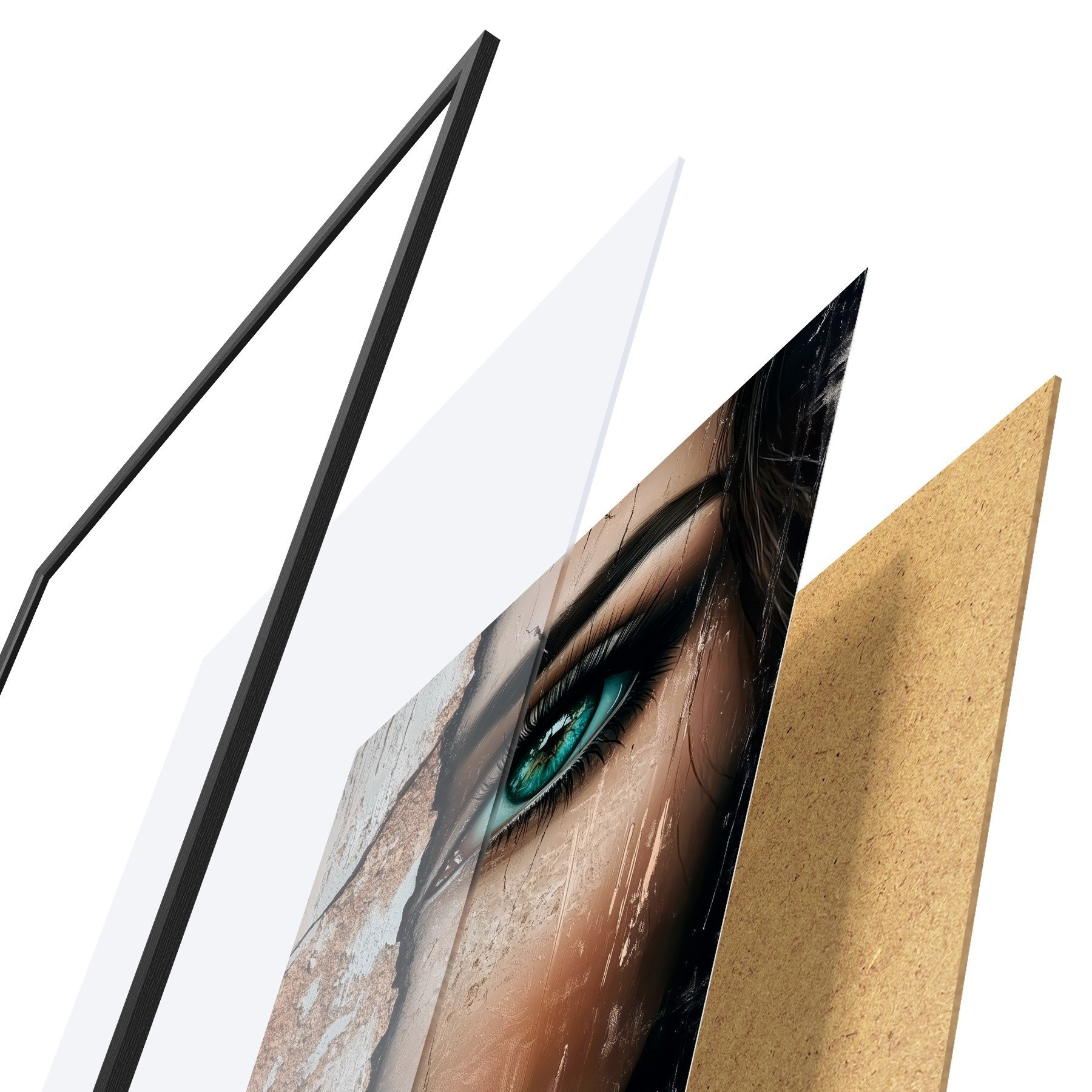 El póster consta de marco, plexiglás, imagen impresa y soporte de aglomerado. El póster puede colgarse inmediatamente en la pared gracias a los soportes de la parte posterior.