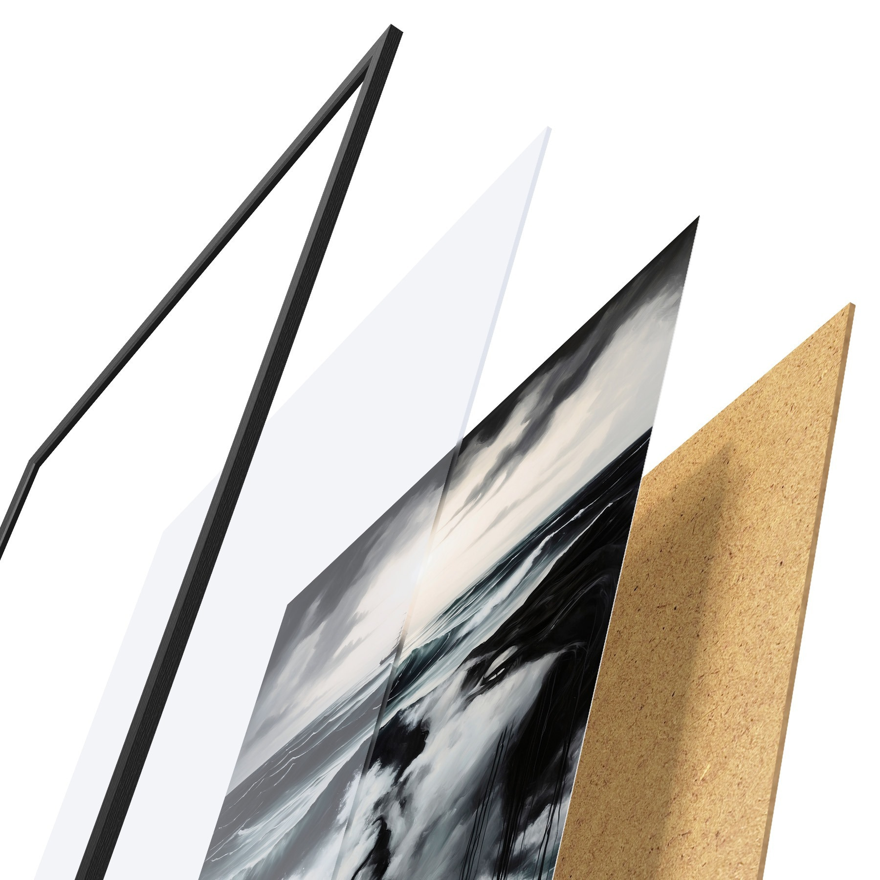 El póster consta de marco, plexiglás, imagen impresa y soporte de aglomerado. El póster puede colgarse inmediatamente en la pared gracias a los soportes de la parte posterior.