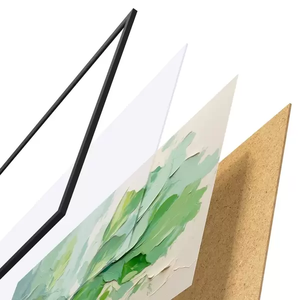 El póster consta de marco, plexiglás, imagen impresa y soporte de aglomerado. El póster puede colgarse inmediatamente en la pared gracias a los soportes de la parte posterior.