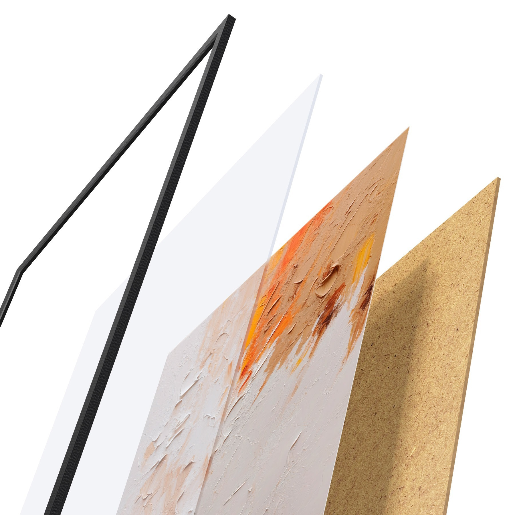 El póster consta de marco, plexiglás, imagen impresa y soporte de aglomerado. El póster puede colgarse inmediatamente en la pared gracias a los soportes de la parte posterior.