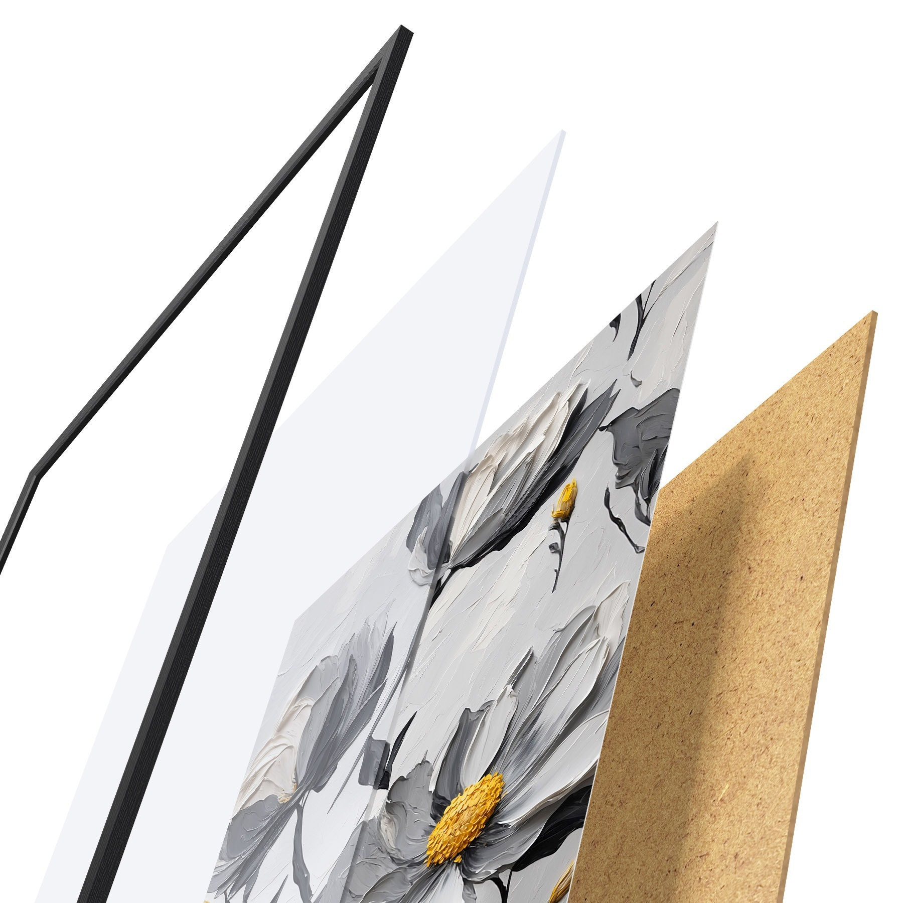 El póster consta de marco, plexiglás, imagen impresa y soporte de aglomerado. El póster puede colgarse inmediatamente en la pared gracias a los soportes de la parte posterior.
