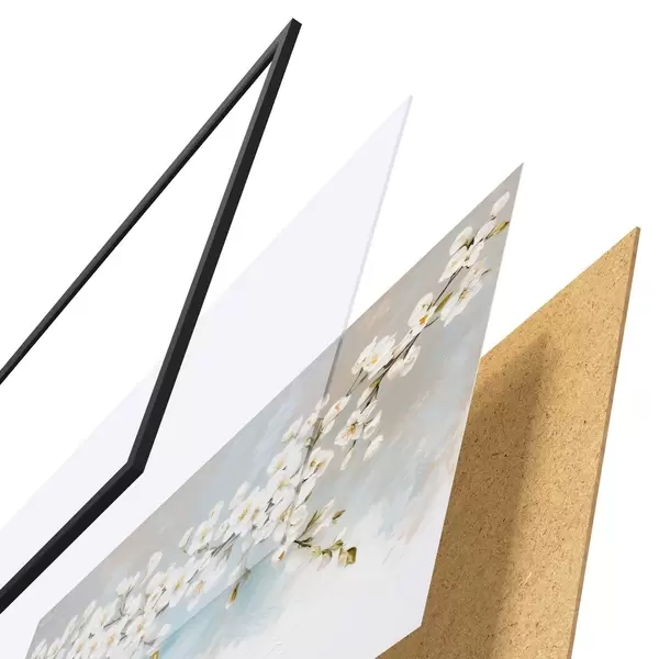 El póster consta de marco, plexiglás, imagen impresa y soporte de aglomerado. El póster puede colgarse inmediatamente en la pared gracias a los soportes de la parte posterior.