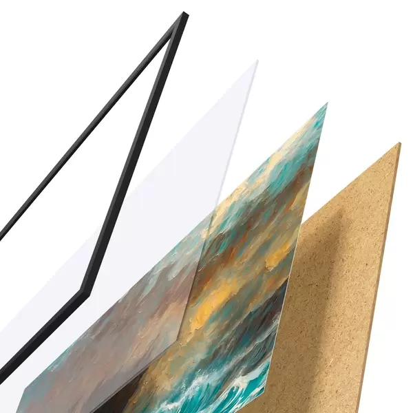 El póster consta de marco, plexiglás, imagen impresa y soporte de aglomerado. El póster puede colgarse inmediatamente en la pared gracias a los soportes de la parte posterior.