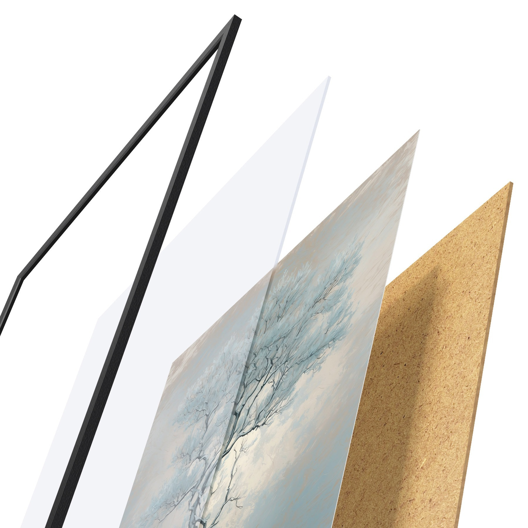 El póster consta de marco, plexiglás, imagen impresa y soporte de aglomerado. El póster puede colgarse inmediatamente en la pared gracias a los soportes de la parte posterior.