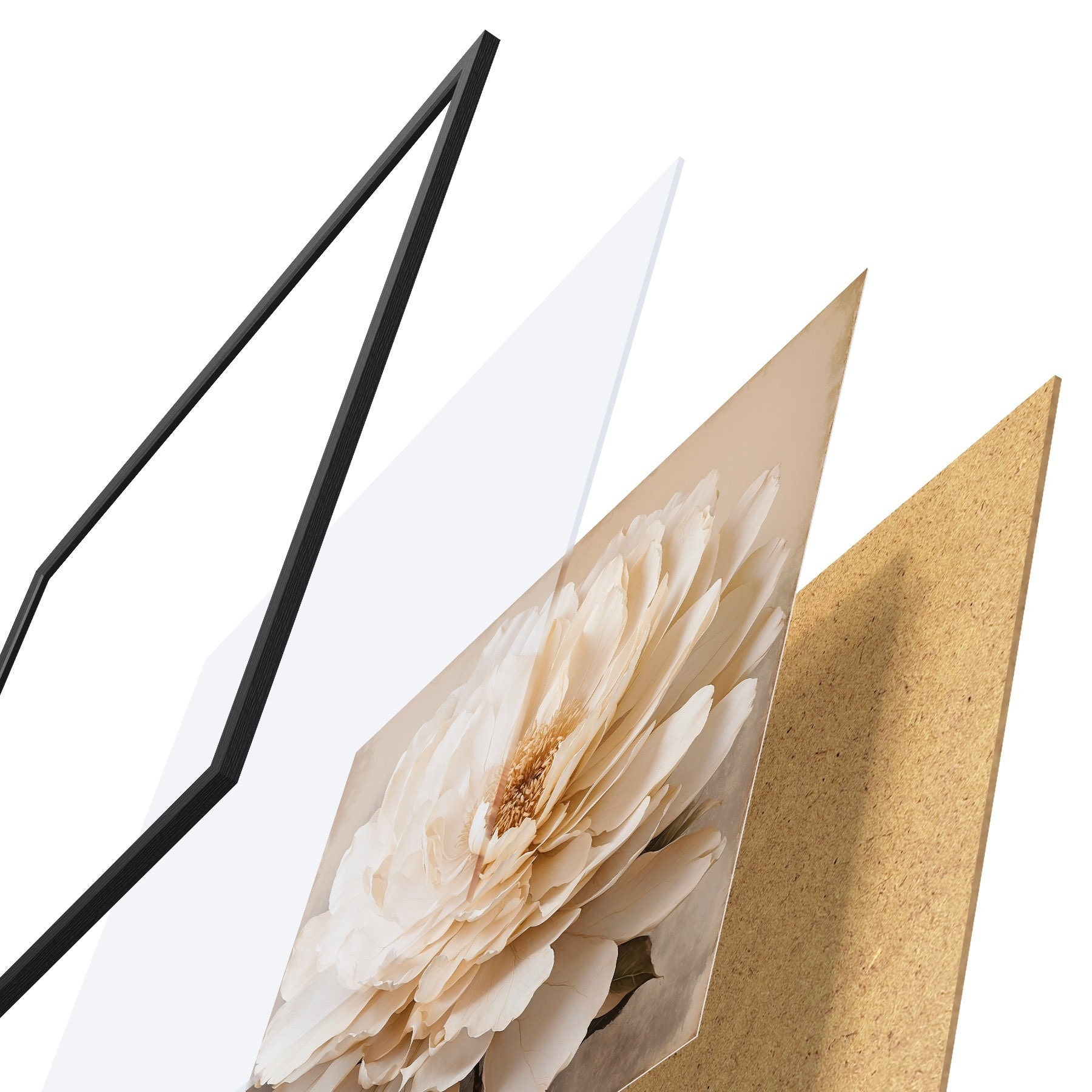 El póster consta de marco, plexiglás, imagen impresa y soporte de aglomerado. El póster puede colgarse inmediatamente en la pared gracias a los soportes de la parte posterior.