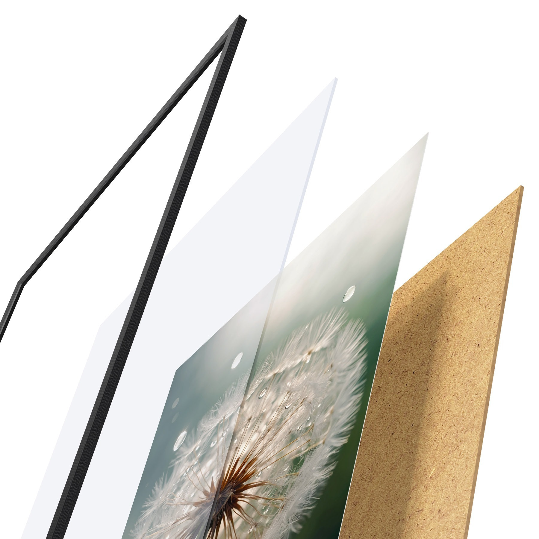 El póster consta de marco, plexiglás, imagen impresa y soporte de aglomerado. El póster puede colgarse inmediatamente en la pared gracias a los soportes de la parte posterior.