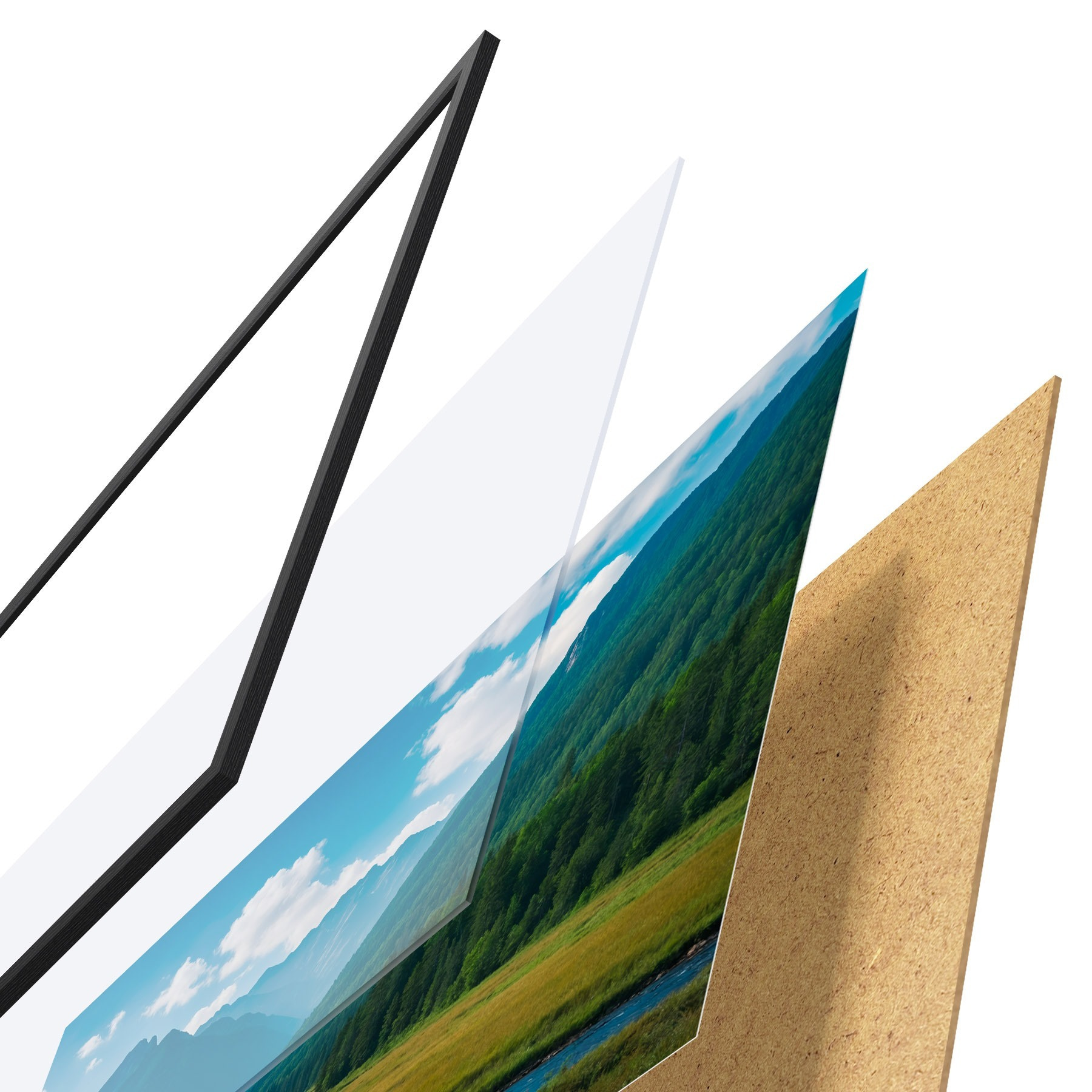El póster consta de marco, plexiglás, imagen impresa y soporte de aglomerado. El póster puede colgarse inmediatamente en la pared gracias a los soportes de la parte posterior.