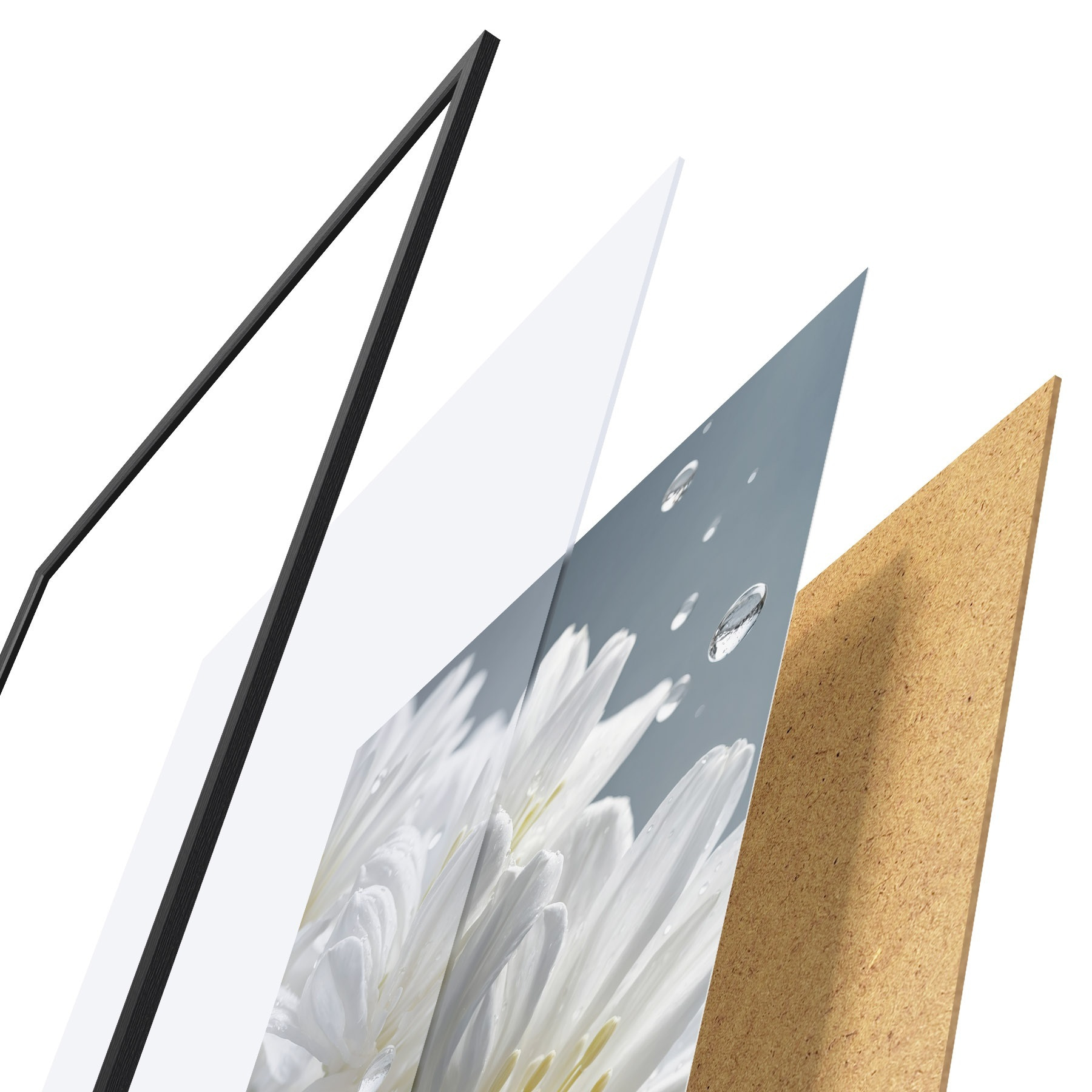 El póster consta de marco, plexiglás, imagen impresa y soporte de aglomerado. El póster puede colgarse inmediatamente en la pared gracias a los soportes de la parte posterior.