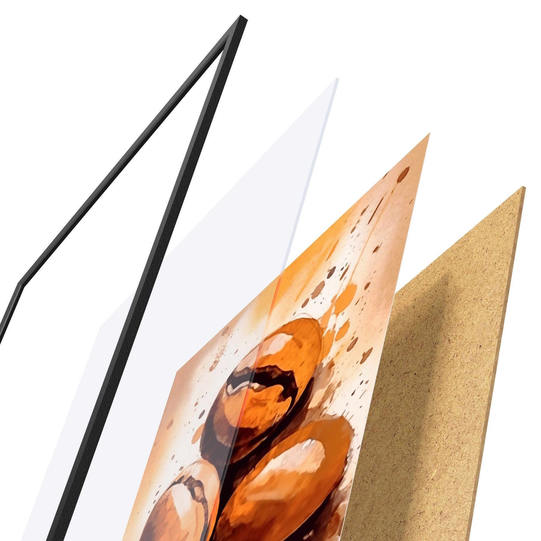 El póster consta de marco, plexiglás, imagen impresa y soporte de aglomerado. El póster puede colgarse inmediatamente en la pared gracias a los soportes de la parte posterior.