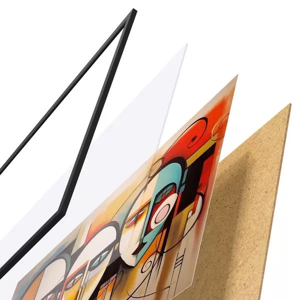 El póster consta de marco, plexiglás, imagen impresa y soporte de aglomerado. El póster puede colgarse inmediatamente en la pared gracias a los soportes de la parte posterior.