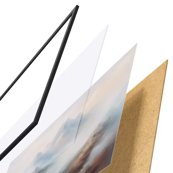 El póster consta de marco, plexiglás, imagen impresa y soporte de aglomerado. El póster puede colgarse inmediatamente en la pared gracias a los soportes de la parte posterior.