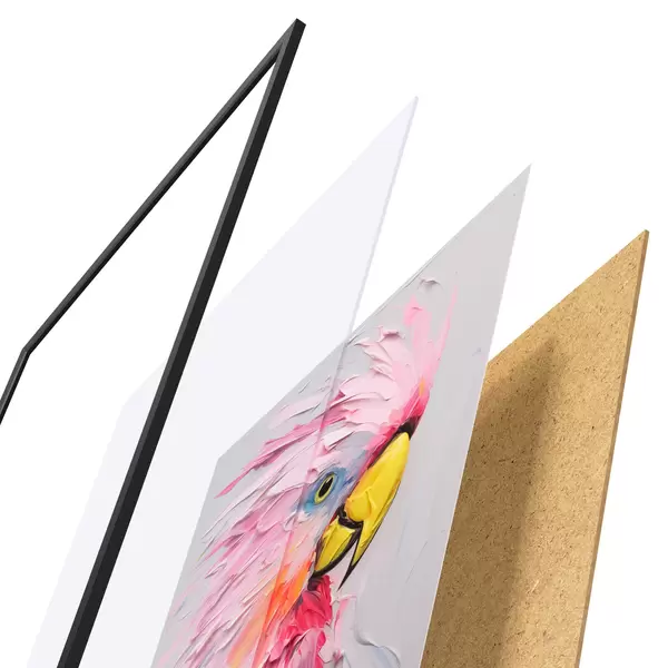 El póster consta de marco, plexiglás, imagen impresa y soporte de aglomerado. El póster puede colgarse inmediatamente en la pared gracias a los soportes de la parte posterior.