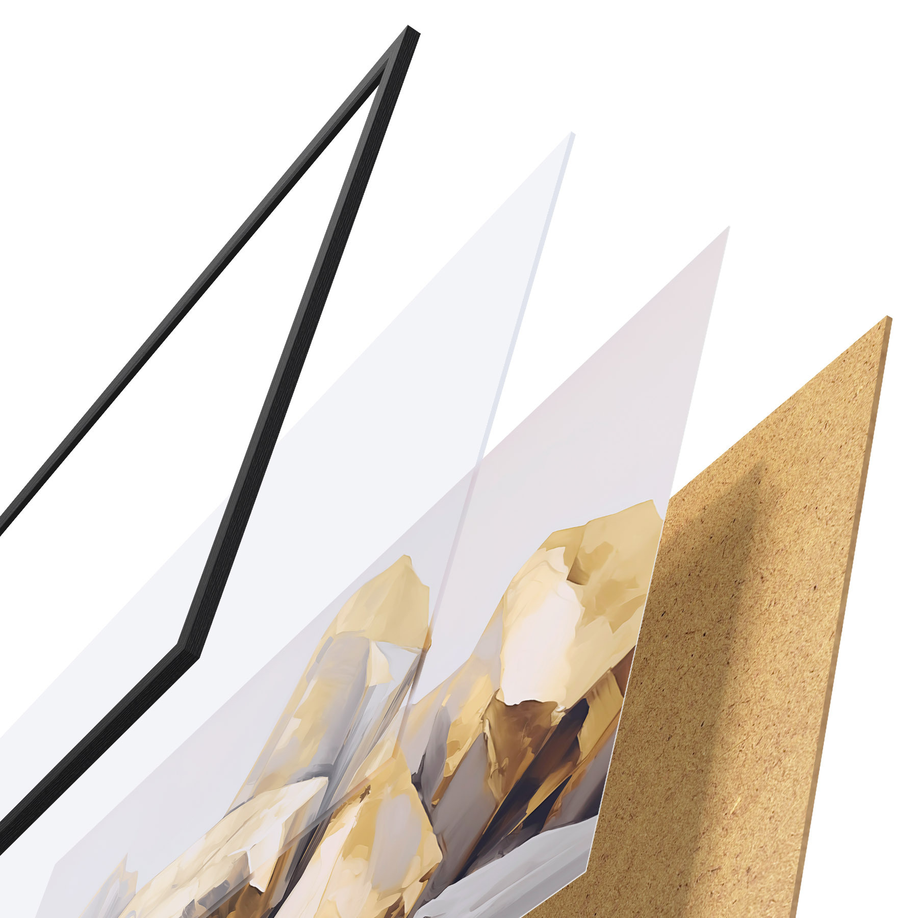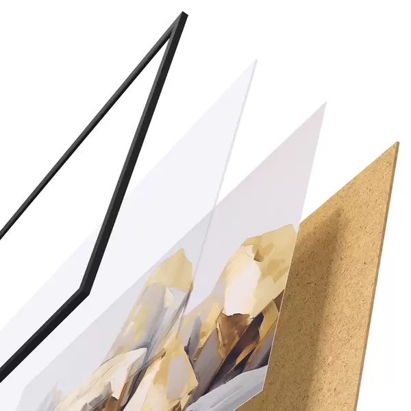 El póster consta de marco, plexiglás, imagen impresa y soporte de aglomerado. El póster puede colgarse inmediatamente en la pared gracias a los soportes de la parte posterior.