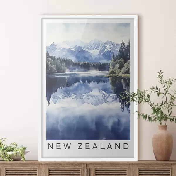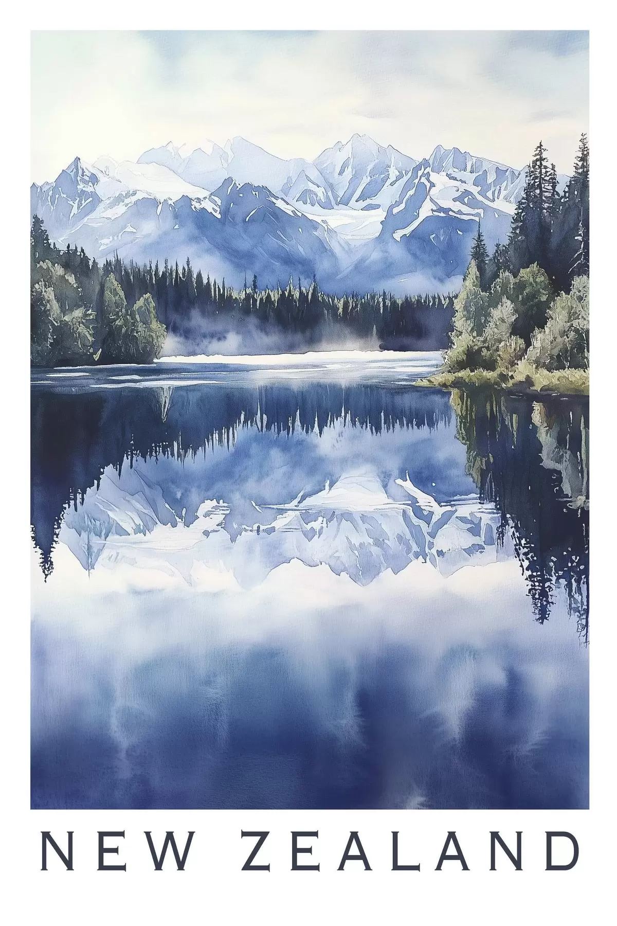 Poster Hermosas montañas en Nueva Zelanda, estilo acuarela, lago, bosque f44144