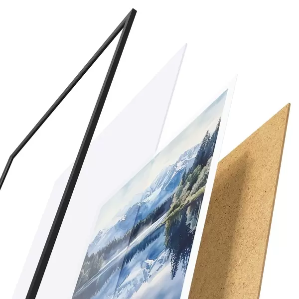 El póster consta de marco, plexiglás, imagen impresa y soporte de aglomerado. El póster puede colgarse inmediatamente en la pared gracias a los soportes de la parte posterior.