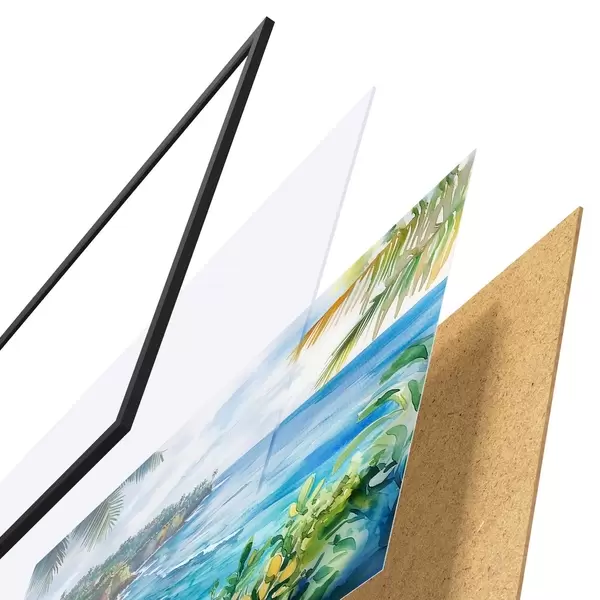 El póster consta de marco, plexiglás, imagen impresa y soporte de aglomerado. El póster puede colgarse inmediatamente en la pared gracias a los soportes de la parte posterior.