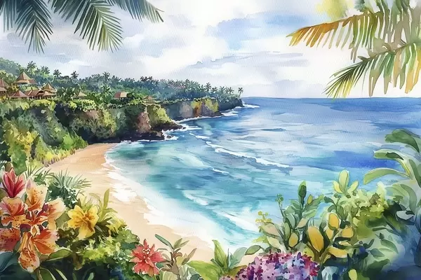 Poster Playa tropical, palmeras, flores, estilo acuarela Nr f44145