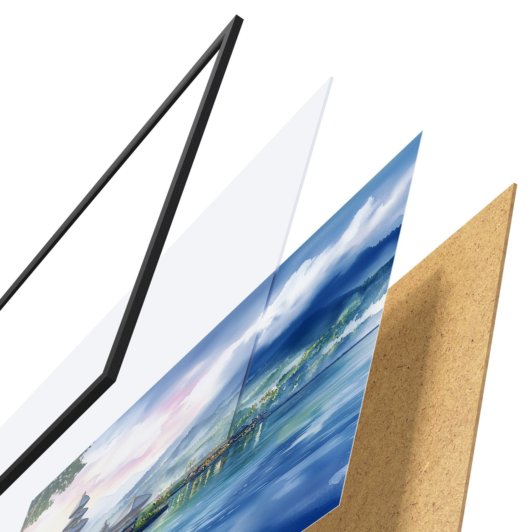 El póster consta de marco, plexiglás, imagen impresa y soporte de aglomerado. El póster puede colgarse inmediatamente en la pared gracias a los soportes de la parte posterior.