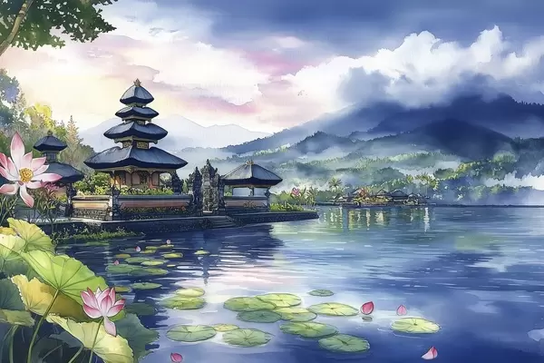 Poster Isla indonesia, templo, budismo, naturaleza tropical, estilo acuarela f44148