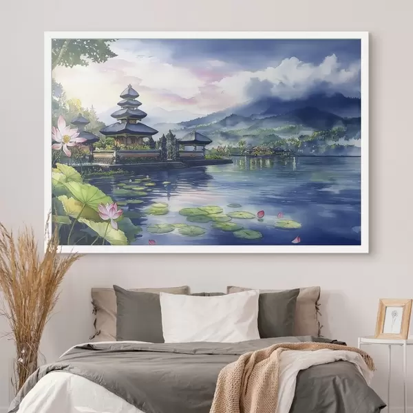 Poster Isla indonesia, templo, budismo, naturaleza tropical, estilo acuarela Nr f44148