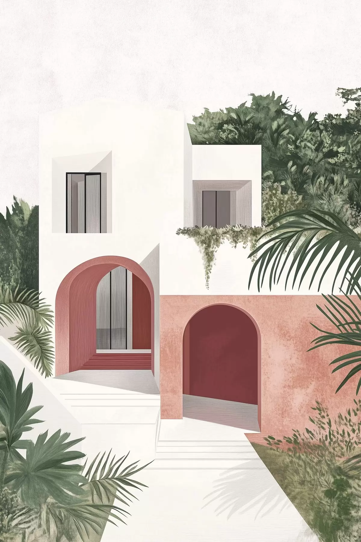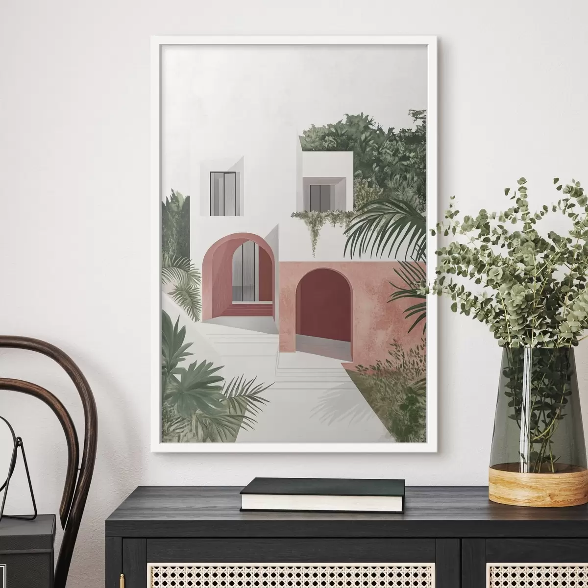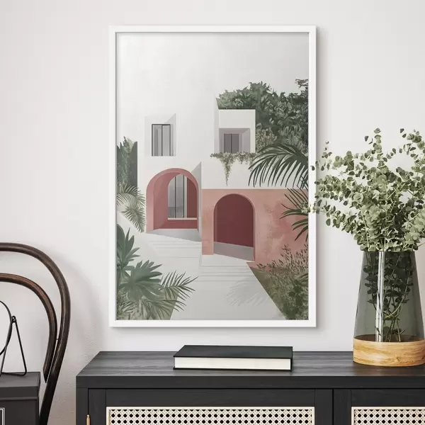 Poster Villa con jardín tropical, estilo mediterráneo, acrílico f44151
