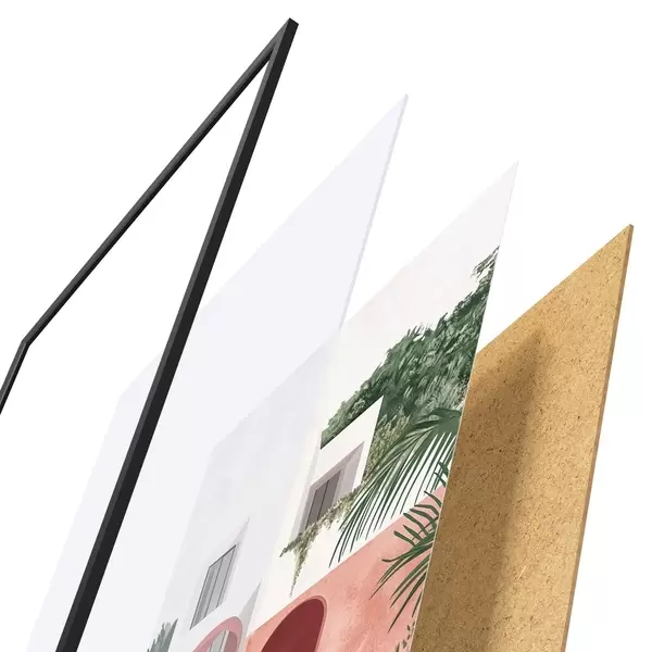 El póster consta de marco, plexiglás, imagen impresa y soporte de aglomerado. El póster puede colgarse inmediatamente en la pared gracias a los soportes de la parte posterior.