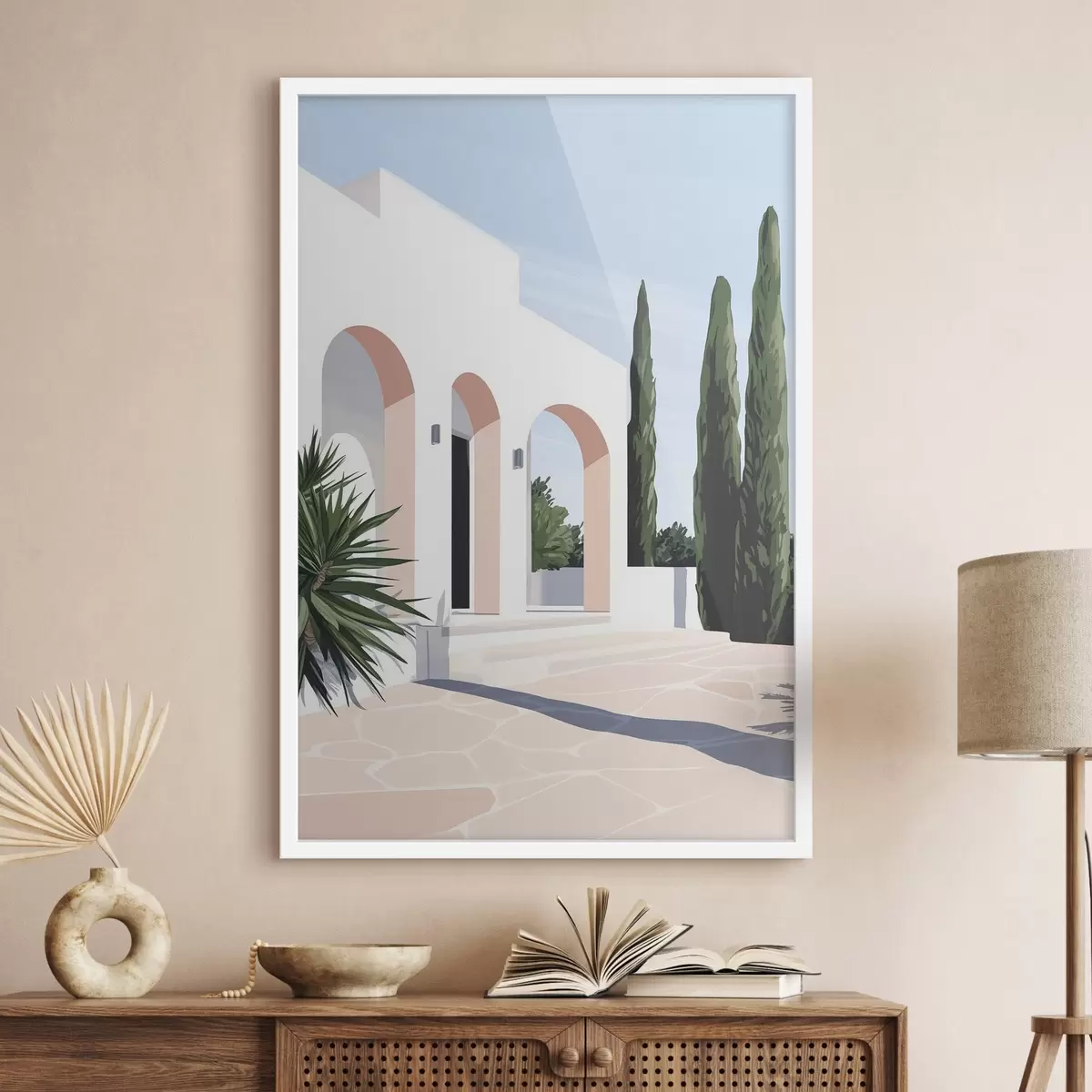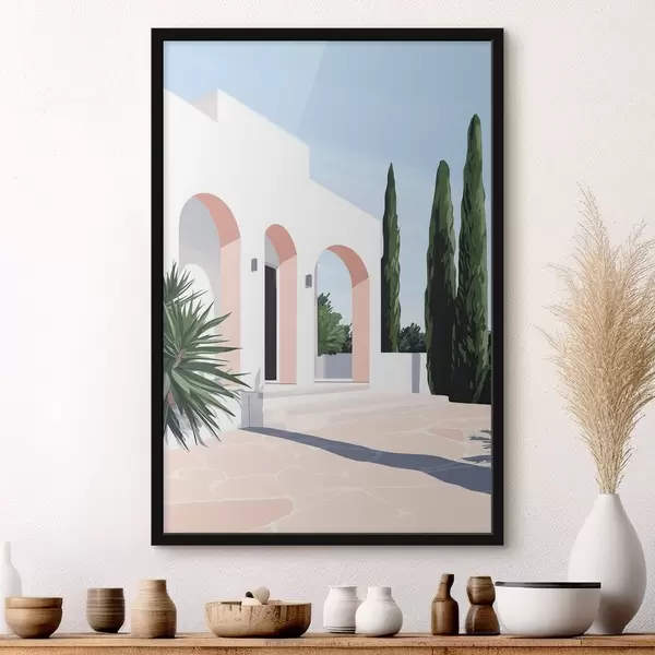 Poster Chalet blanco con arcos y jardín tropical, mediterráneo, estilo llano Nr f44153