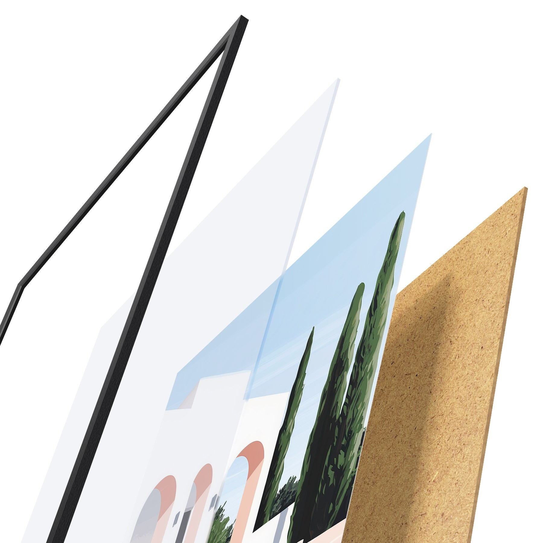 El póster consta de marco, plexiglás, imagen impresa y soporte de aglomerado. El póster puede colgarse inmediatamente en la pared gracias a los soportes de la parte posterior.