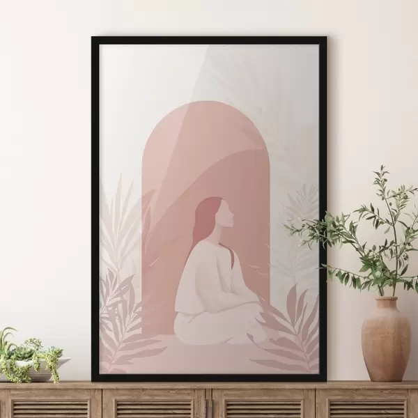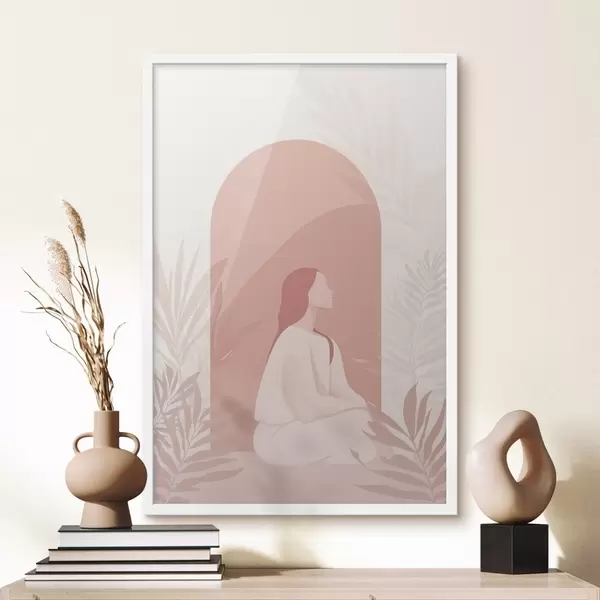 Poster Mujer en meditación, estilo plano, plantas tropicales, colores rosas f44154