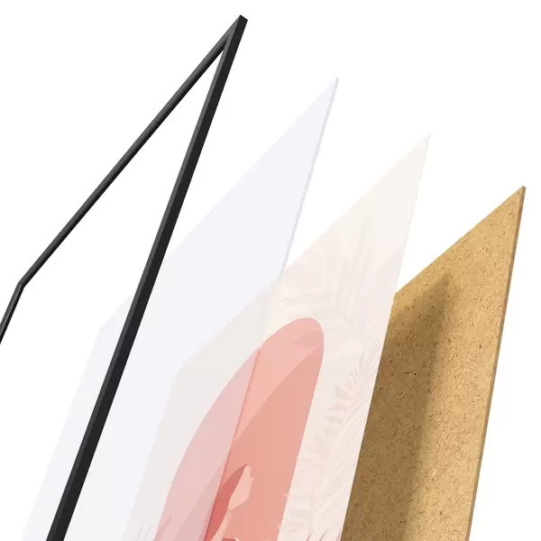 El póster consta de marco, plexiglás, imagen impresa y soporte de aglomerado. El póster puede colgarse inmediatamente en la pared gracias a los soportes de la parte posterior.