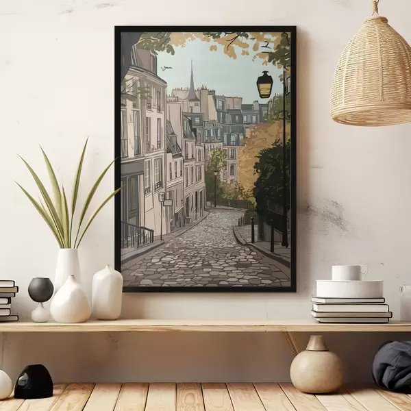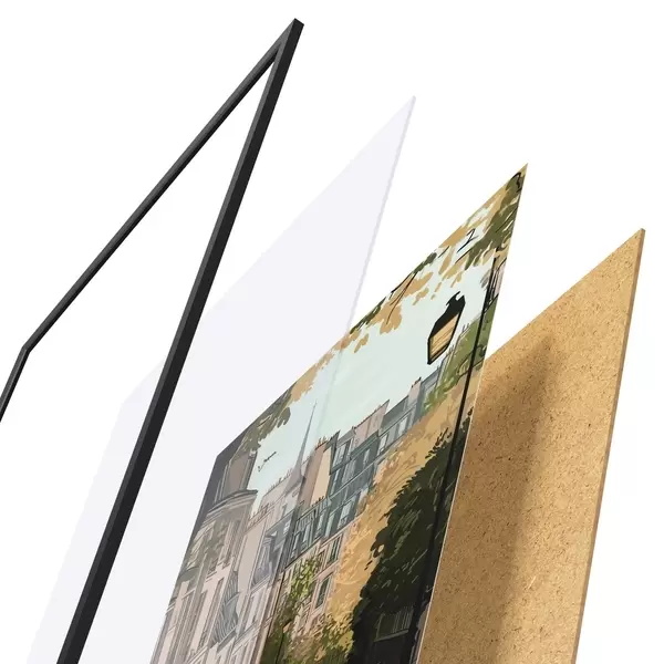 El póster consta de marco, plexiglás, imagen impresa y soporte de aglomerado. El póster puede colgarse inmediatamente en la pared gracias a los soportes de la parte posterior.