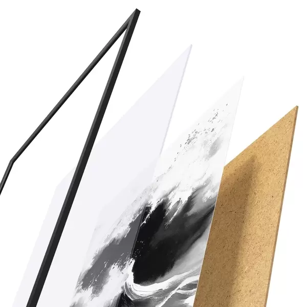 El póster consta de marco, plexiglás, imagen impresa y soporte de aglomerado. El póster puede colgarse inmediatamente en la pared gracias a los soportes de la parte posterior.