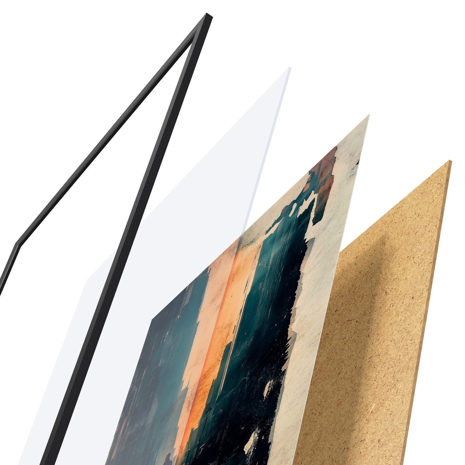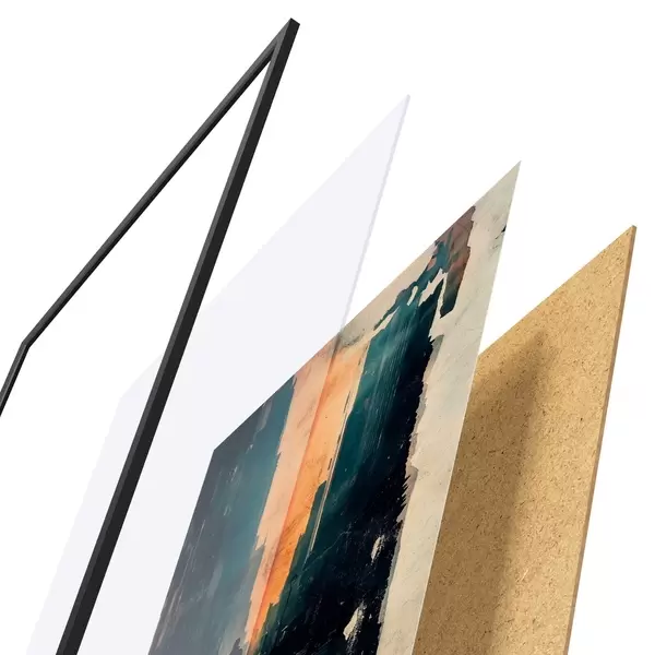El póster consta de marco, plexiglás, imagen impresa y soporte de aglomerado. El póster puede colgarse inmediatamente en la pared gracias a los soportes de la parte posterior.