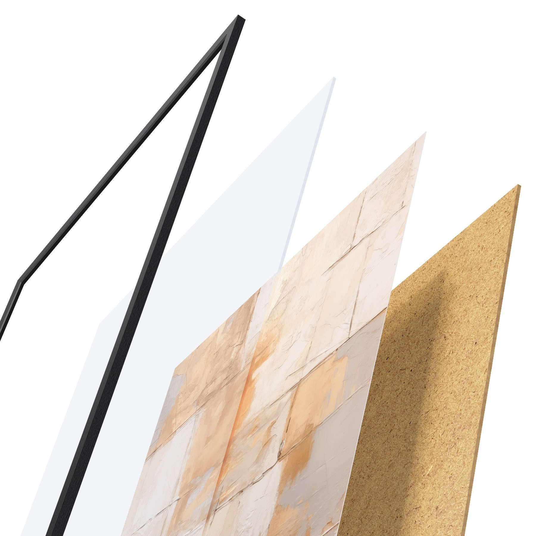 El póster consta de marco, plexiglás, imagen impresa y soporte de aglomerado. El póster puede colgarse inmediatamente en la pared gracias a los soportes de la parte posterior.