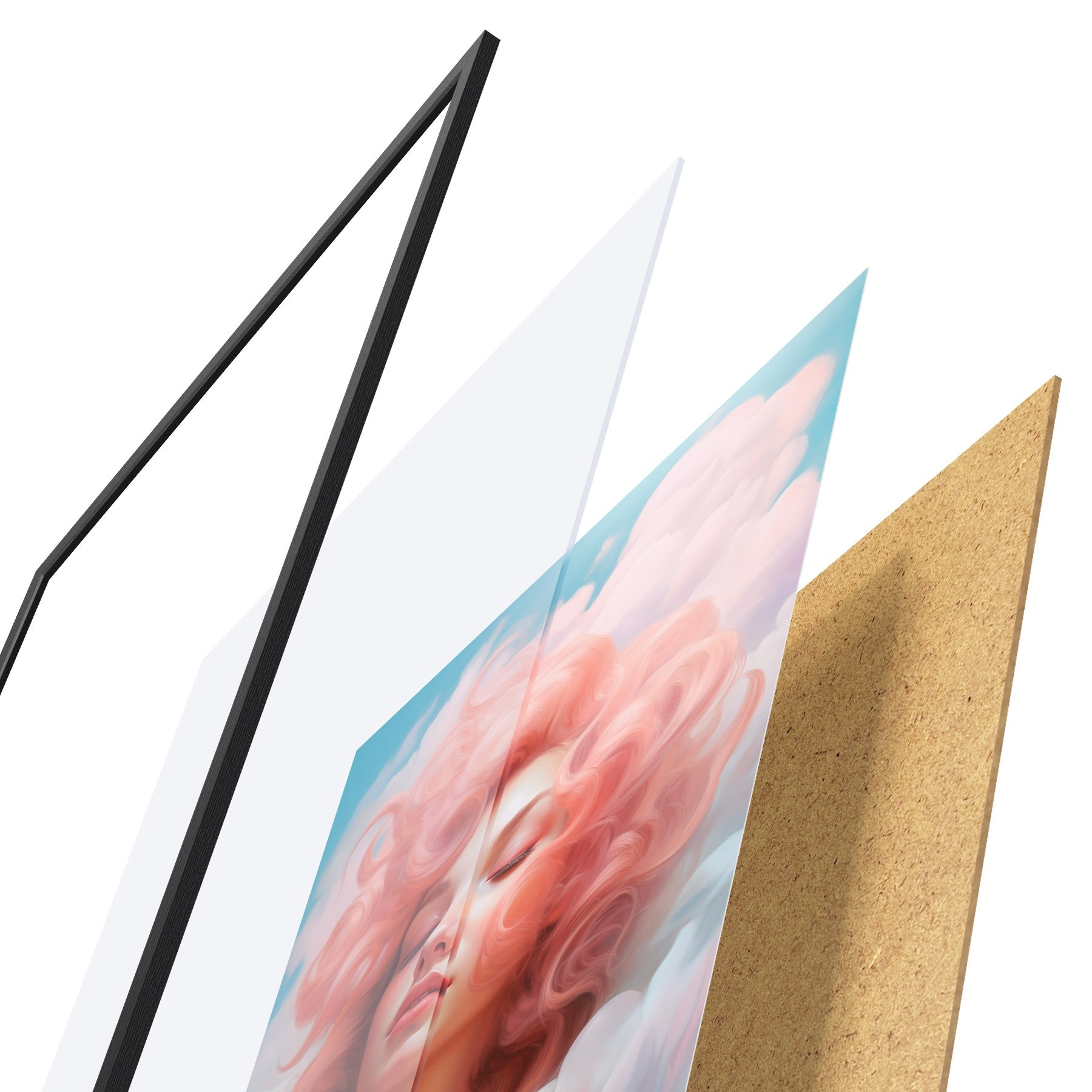 El póster consta de marco, plexiglás, imagen impresa y soporte de aglomerado. El póster puede colgarse inmediatamente en la pared gracias a los soportes de la parte posterior.