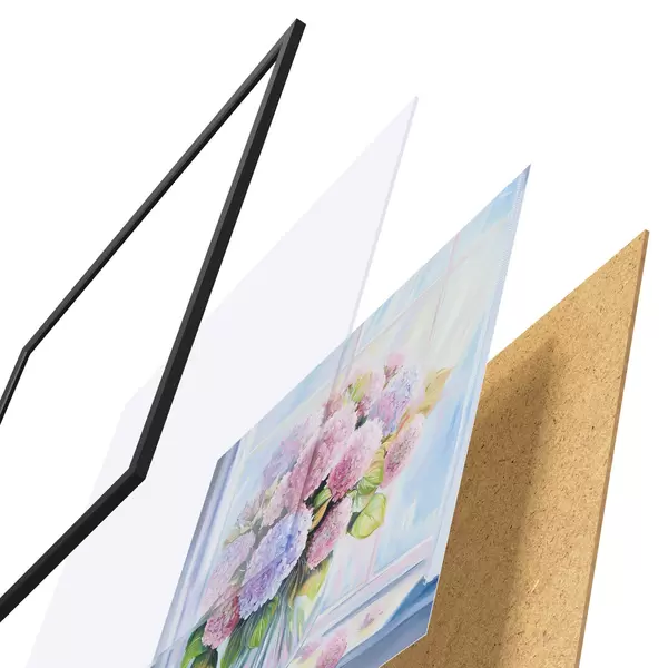 El póster consta de marco, plexiglás, imagen impresa y soporte de aglomerado. El póster puede colgarse inmediatamente en la pared gracias a los soportes de la parte posterior.