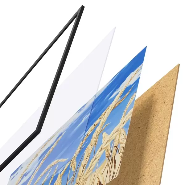 El póster consta de marco, plexiglás, imagen impresa y soporte de aglomerado. El póster puede colgarse inmediatamente en la pared gracias a los soportes de la parte posterior.